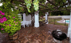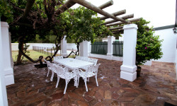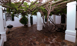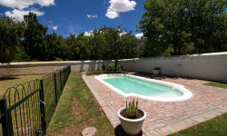 There is a large walled garden, with a swimming pool, and and extensive lawned area with views of the mountains surrounding Graaff-Reinet, and a beamed, shaded patio with a table, chairs and braai facilities, under an ancient vine.